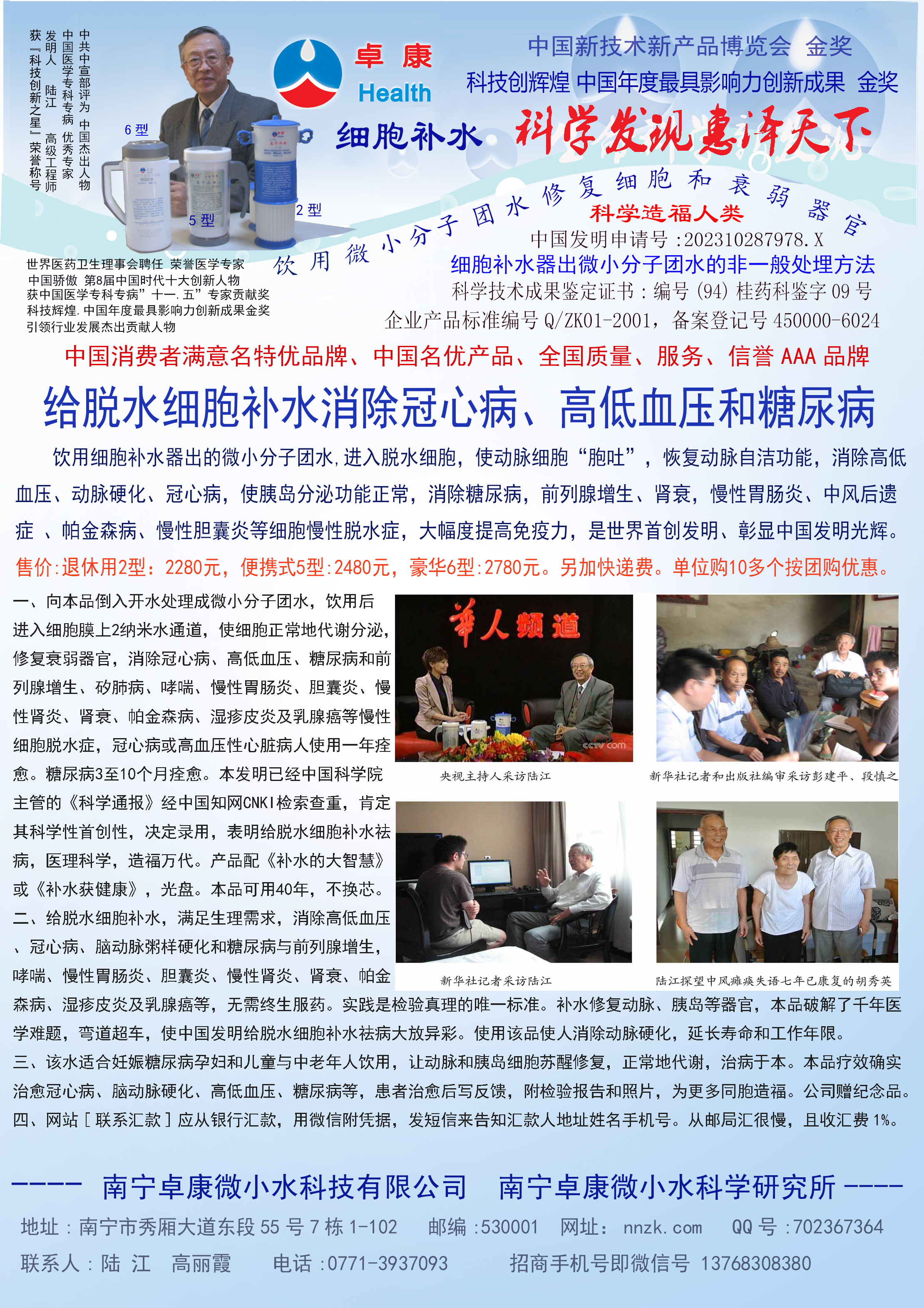 人類幾千年來患以上病癥需終生服藥,幾十年也不能治愈。可是我國南寧的高級工程師陸 江,于1990年想根治高血壓,研究發明了離子水瓶,處理出微小分子團水供飲用,經過醫院臨床試用和專家鑒定,1999年獲中國發明專利權,產品于2000年投放市場后一直跟蹤調查,據全國各地用戶反饋:祛除了高低血壓、糖尿病和冠心病,并使前列腺增生、咽喉炎、鼻竇炎、慢性氣管炎、支氣管炎、矽肺病、哮喘、慢性胃炎、腸炎、慢性膽囊炎、慢性腎炎、腎衰、膀胱炎、便秘、痔瘡、風濕性關節炎和濕疹皮炎及中風后遺癥等病癥不藥而愈。為什么喝微小水能治20多種病?陸 江從1991年德國科學家發現細胞膜水通道僅為2納米獲得啟發,認為多種器官患病是因細胞脫水,不能正常代謝和分裂增殖,才使器官細胞減少致衰弱萎縮而形成細胞缺水性病癥。22年來的實踐有力地支持了“細胞脫水致病”這一重要論點,表明喝微小水可滿足細胞的生理需求,補水就能祛病,是生命科學新亮點。
